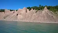 The bluffs are formed from eroded drumlins, teardrop-shaped hills of glacial till that were deposited and shaped by glaciers during the most recent ice age. The erosive power of wind, rain, snow, and waves has formed the landscape into sharp pinnacles.[5] Although the pinnacles and cliffs, some of which rise up to 150 feet (46 m) above the lake shore,[6] have existed for thousands of years, they are constantly changing and further eroding.[5]