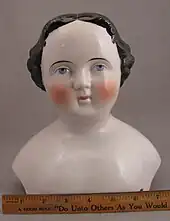 A typical china doll has a head made of glazed white porcelain, with painted molded hair and facial features.[4][2] The glaze gives the doll a characteristic glossy appearance.[4] The head is typically attached to a body made of cloth or leather, sometimes with arms and legs made of porcelain.[4] Some early china head dolls were placed on peg jointed wooden bodies. China doll parts were also sold for the customer to fashion a body and clothing.[4][2] Some cloth bodied china dolls could be more than 30" (76 cm) tall, and others as small as 3" (7.5 cm). Some china dolls, like the Frozen Charlotte dolls, were made entirely out of porcelain, with head and body made in one piece without any articulation.[4] The Frozen Charlotte dolls range in size from 2.5 cm (1 inch) in height up to 46 cm (18 inches).[2]