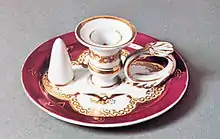 Mary Lincoln was so happy with the china service that she also ordered a small set for the family's personal use,[23][32] and a "toilet set" for use in the family bedrooms. The toilet set was ordered on July 18, 1861, and consisted of two services. The one for Abraham and Mary Lincoln consisted of a ewer and basin, covered chamber pot, soap box, brush tray, jug, foot bath, and slop jar.[33] It cost $45, and was decorated with the solferino border,[33] although the Alhambra edging was replaced with a quatrefoil and tassel motif.[24] The Great Seal of the United States was replaced with a Gothic "ML" in the center.[34][32] A plain white toilet set, with the same items, formed the second set. This less fancy set cost just $24.50. Mrs. Lincoln ordered a third fancy toilet set, this one decorated with the U.S. coat of arms, on July 30. It appears intended for Mrs. Lincoln's bedroom, as it also included a ewer, sponge box, powder box, and pair of candlesticks. The cost of the third toilet set was $115.[33]