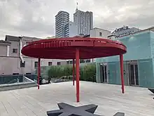 "One Hundred Years: History of the Chinese in America", a mural painted by James Leong originally for the Ping Yuen housing project in Chinatown, was enlarged, printed, and wrapped in 2012 around the Hogan & Vest building prior to that building's demolition.[10] Three temporary artworks were also displayed on the construction site fence: Panorama by Kota Ezawa in 2013–14, Sight Plan by Maria Park in 2016–17,[11][12][13][14][15] and Procession by Jason Jägel in 2017.[11][16][17]