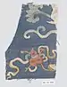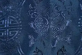 Chinese auspicious ornaments in textile and clothing refers to any form of Chinese auspicious ornaments, which are used to decorate various forms of Chinese textile and clothing (including Hanfu and Qizhuang), fashion accessories, and footwear in China since the ancient times.[1][2] Chinese auspicious ornaments form part of Chinese culture[2] and hold symbolic meanings.[1] In ancient China, auspicious ornaments were often either embroidered or woven into textile and clothing.[1] They are also used on religious and ritual clothing (e.g. Daojiao fushi which is Taoist clothing[3]: 101 and Chinese Buddhist clothing) and in Xifu, Chinese opera costumes.[4] Auspicious symbols and motifs continue to be used in present day China in industries, such as home textiles and clothing; they are also used in modern design packaging and interior design.[5] Some of these Chinese auspicious ornaments were also culturally appropriated by European countries during the era of Chinoiserie, where they became decorative patterns on fashionable chinoiserie fashion and textiles.[6]