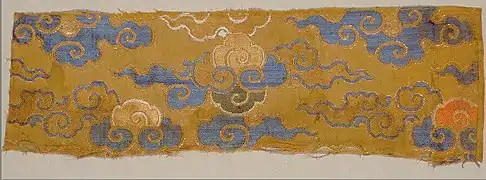 Clouds, also referred as auspicious clouds (xiangyun 祥云), are the symbols of good fortune and happiness,[18] as well as a good omen of peace and the symbol of heavens.[17] Clouds designs have been used in artworks as early as the Eastern Zhou dynasty.[19] in the ancient times, auspicious clouds were of associated with deities and good fortune.[19]