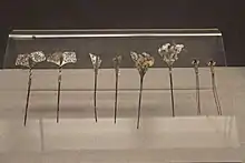 The buyao was an elaborate and exquisite form of hairpin which denoted noble status.[3] It was generally made of gold and was often decorated with jewels (such as pearls and jade) and carved designs (such as in the shape of dragons or phoenix).[3][13] It looked similar to a zan,[12] but one of its main characteristics is its dangling features, which gave it its name 'buyao' (lit. "shake as you go" or "that sway with each step" or "step shake").[3][9][18][12] The buyao became popular in the Western Han dynasty.[13]