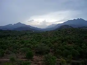 There are 963 species of flowering plants in the sanctuary.[7] Ecoregions of the sanctuary comprise mostly grassland and wet grasslands vegetation and some South Western Ghats montane rain forests and high shola at the higher western elevations. South Western Ghats moist deciduous forests at mid elevations give way to dry deciduous forests and thorny scrub forests in the lower dryer eastern edges of the valley. The major xerophytic species in the thorny scrub forests are Acacia arabica, Acacia leucofolia, Acacia concinna, Prosporis juliflora, and Opuntia stricta.[9]