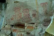 The painting zone is very large and dominates much of the landscape of the site. The bottom part of the hill has thousands of rocks with petroglyphs. There are petroglyphs at the base and the top of the plateau. There is no similarity between the paintings and the older petroglyphs, which may belong to completely separate traditions. The paintings resemble cave paintings located on the Rio Grande at the mouth of the Pecos River.[1] The Pecos style is dated to about four thousand years ago, the approximate age of the site's paintings.[1]