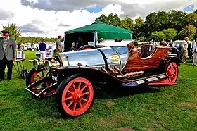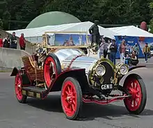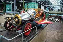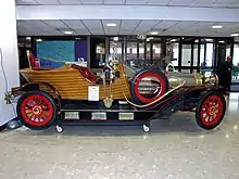 There is an MGM-licensed replica in the United Kingdom, built by Tony Green from the original plans for a commercial photography business over a three-year period, starting in 2000.[39] The car is roadworthy and has the registration number GEN 22.[40] It weighs around 1.5 short tons (1.4 t) and is nearly 18 ft (5.5 m) long and 6 ft (1.8 m) wide. The brass lamps are all original period pieces and the brass snake horn came from one of the original Chitty cars. The engine is a 3L V6 Ford with a BorgWarner automatic gearbox.[41][42]