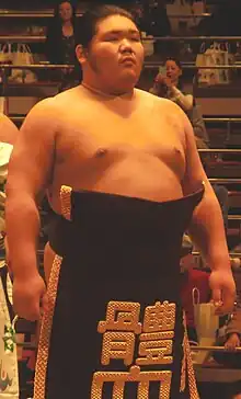 Upon graduating, he joined former yokozuna Chiyonofuji's stable on January 24, 2011. However, his tournament debut was delayed because the March tournament was cancelled in the wake of the Sumo match-fixing scandal gripping the world of sumo at the time. During this time, due to the uncertainty about the future of sumo, he considered quitting to become a teacher, but he decided in the end it was better to continue. He participated in the following technical examination tournament in May. Because of his university success he was allowed to make his debut at the rank of makushita 15. He did not fare well in this tournament and after three consecutive losses he withdrew from the tournament due to a right lower thigh inflammation. It was the first time since World War II that a makushita tsukedashi wrestler had withdrawn from his debut tournament, and he was criticized by some commentators for ducking a challenge.[2] He admitted to shedding tears at the comments from his hospital bed.[2] Fighting back from falling to makushita 46 in the following July tournament, he posted two consecutive 6-1 records, and then a 4–3 record in the November 2011 tournament to achieve promotion to the salaried jūryō ranks.