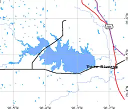 Choke Canyon Reservoir is 4 miles (6 km) west of the town of Three Rivers and about 65 miles (105 km) south of the city of San Antonio. It impounds water from the Frio River shortly before the river's confluence with the Nueces River. The reservoir covers 25,670 acres (103.9 km²) in Live Oak and McMullen counties, and has a capacity of more than 695,000 acre-feet (857,000,000 m3) of water.