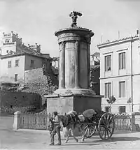 In 1658, a French Capuchin monastery was founded by the site; in 1669 the monastery succeeded in purchasing the monument, which by the early 19th century was being used as the monastery library.[5] The monument was popularly known as the "Lantern of Demosthenes"[6] or "Lantern of Diogenes",[7] although a reading of its inscription by Jacob Spon had established its original purpose.[8] The young British architects James "Athenian" Stuart and Nicholas Revett published the first measured drawings of the monument in their Antiquities of Athens (London 1762). The monument became famous in France and England through engravings of it, and contemporary versions of it became eye-catching features in several English landscape gardens. Lord Byron stayed at the monastery during his second visit to Greece. In 1818, friar Francis planted in its gardens the first tomato plants in Greece. In 1821 the convent was burned by the Ottomans during the Greek War of Independence, and subsequently demolished, and the monument was inadvertently exposed to the weather.[9] In 1829, the monks offered the structure to an Englishman on tour, but it proved to be too cumbersome to disassemble and ship. Lord Elgin negotiated unsuccessfully for the monument, by then an icon in the Greek Revival.