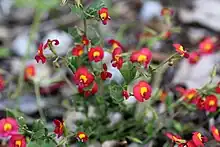 Chorizema rhombeum is a species of flowering plant in the family Fabaceae and is endemic to the southwest of Western Australia. It is a prostrate to ascending or twining shrub with egg-shaped or rhombic leaves, and orange to pink, or red and yellow pea flowers.