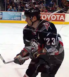 Drury spent just one season with the Flames before he was traded on July 3, 2003, along with Steve Bégin, to the Buffalo Sabres in exchange for former Avalanche teammate Steven Reinprecht and Rhett Warrener.[14] Traded twice in two seasons, Drury was admittedly frustrated.[15] However, Drury regained his form and excelled in Buffalo, serving as co-captain with Daniel Brière from 2005 to his departure via free agency in 2007. With his previous numbers (37 with Colorado and 18 with Calgary) both taken in Buffalo, Drury switched to 23 in honor of his childhood hero, New York Yankees first baseman Don Mattingly.[16]