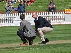 Chris Harris presenting a pitch report for Sky Sport before a Super Smash game at the Basin Reserve.