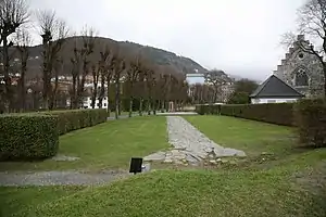 Christ Church site with hedge is placed where the outer walls are thought to have been