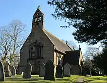 The church is constructed in red sandstone, with a red tiled roof.[2] Its architectural style is that of the 13th century.[3] The plan consists of a four-bay nave and a two-bay chancel in one range, a transept and a vestry on the north side, a south porch, and a two-tier double bellcote at the west end. The buttresses include a massive stepped buttress on the south side at the division of the nave and the chancel. The windows in the nave have two lights, and those in the chancel have three lights. Inside the church, the nave is divided from the chancel by a low wall and a double chamfered arch.[2][3] The organ was built in 1871 by Gray and Davidson.[4]