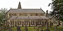 The church is constructed in sandstone from Storeton quarry,[4] and has slate roofs.[2] Its architectural style is that of the 13th century.[3] The plan consists of a seven-bay nave with a clerestory, north and south six-bay aisles under lean-to roofs, a chancel, a north vestry, a north organ loft, and a northwest steeple. The windows along the sides of the aisles are paired lancets, and there is a three-light window in the southwest of the nave. In the clerestory are three-light windows with trefoil heads. The west window of the nave has four lights containing Geometric tracery; this is flanked by lancet windows. Below the window is a gabled entrance. The chancel has a four-light east window, the vestry has a three-light west window with plate tracery and three trefoil-headed east windows, and the organ loft has three lancets with a spherical triangle window above. The tower has angle buttresses, a west entrance, and a north two-light window with plate tracery. The bell openings are louvred with trefoil heads. The tower is surmounted by a shingled broach spire.[2] Set into the wall of the porch is a stone bearing the fossilized footprint of a Chirotherium, an archosaur.[2][3]