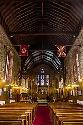 The cathedral is built on the site of Holy Trinity Church, which was destroyed by a peat slip that destroyed part of Stanley in 1886.[1] The new building was designed by Sir Arthur Blomfield and built in 1890–1892 from the local stone and brick.[3] It incorporates a tower with a ring of five bells, 19th- and 20th-century stained glass windows, and a two-manual pipe organ built in Ireland.[4] Bishop Waite Stirling consecrated the new cathedral on 21 February 1892.[1]