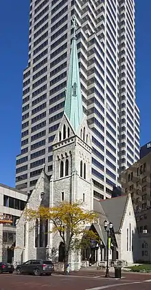 Designed by Irish-born architect William Tinsley in an English Gothic Revival style,[6][14] the church cost between $32,438 and $37,750 to build.[15] Its cornerstone was laid on June 24, 1857, and the first worship service was held on May 22, 1859.[4][10][11] A spire was added to the church's tower in 1869 at a cost of $1,425.[16][17] Electric lights were installed in 1886. A new Episcopal residence was completed on the Circle in 1871, and a brick Sunday School building was completed in 1876. The parish considered relocating north of downtown Indianapolis in 1889 and deliberated over several similar options on several subsequent occasions, but each time the parishioners decided to remain on the Circle.[10][18]