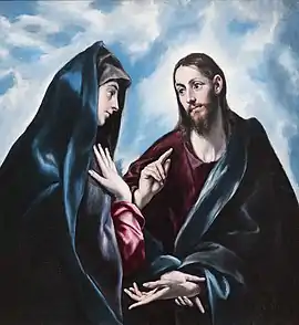 Christ says farewell to his mother Mary, often blessing her, before leaving for his final journey to Jerusalem, which he knows will lead to his Passion and death; indeed this scene marks the beginning of his Passion.[3] On Christ Taking Leave of his Mother, son's and mother's left and right hands are intertwined, and the fingers of their other hands are pointing in different directions. The faces of Jesus and Mary express pure love and acceptance between two people.[4] The figures show certain dependence on Michelangelo, especially El Greco's elongation of the hands.[1] The painting displays the formative influence of El Greco's time in Venice.[2]