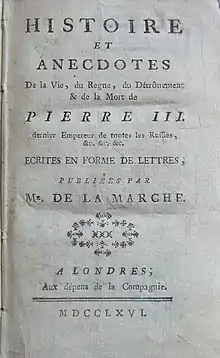 - Histoire et anecdotes de la vie, du règne, du détrônement & de la mort de Pierre III ... Ecrites en forme de lettres, publiées par Mr. de la Marche, 1766