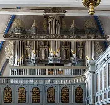 His surviving organs are at Bockhorn, Oldenburg (1722); Oude Kerk, Amsterdam (1726); Wiefelstede, Oldenburg (c.1729); St Nikolai, Gifhorn (1748) and Hohenrode, Bad Hersfeld (1749); remnants such as cases and pipework survive elsewhere. His organs have well-balanced specifications and are typical of the late northern German Baroque organ.