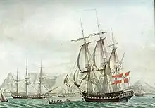 The ship was a British frigate taken as a prize taken by the French Navy at Ile de France in 1798. She was first acquired by Selbye & Terboch and then in 1800 sold to the Danish Asiatic Company in 1800 and subsequently renamed Christianshavn. She was renamed Frederik VI circa 1828.[1][2]