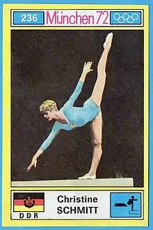 Christine Schmitt (later Christine Dressel, born 26 May 1953) is a retired German gymnast. She competed at the 1972 Summer Olympics in all artistic gymnastics events and won a silver medal in the team competition. Her best individual result was 11th place in the vault.[1] She won another silver medal with the East German team at the 1970 World Artistic Gymnastics Championships.[2]