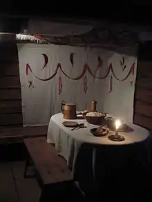 The usual Christmas decorations are spruce twigs, Christmas tree, Christmas wreaths, straw goats, himmelis, apples, candles, Christmas tablecloths, Christmas flowers, outdoor torches, ice lanterns and sheafs.[20]
