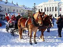 Other aspects of Polish Christmas include nativity plays called "Jasełka" or "Herody", outdoor nativity scenes, the singing of carols, most notably "God Is Born", and Kulig, a horse-pulled sleigh ride. The tradition of crafting and hand-making Christmas szopkas in Kraków was declared UNESCO Intangible Cultural Heritage.[1]