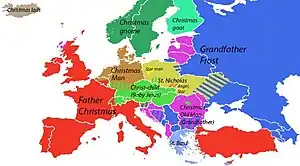In South Tyrol (Italy), Austria, Czech Republic, Southern Germany, Hungary, Liechtenstein, Slovakia, and Switzerland, the Christkind (Ježíšek in Czech, Jézuska in Hungarian and Ježiško in Slovak) brings the presents. Greek children get their presents from Saint Basil on New Year's Eve, the eve of that saint's liturgical feast.[65] The German St. Nikolaus is not identical with the Weihnachtsmann (who is the German version of Santa Claus / Father Christmas). St. Nikolaus wears a bishop's dress and still brings small gifts (usually candies, nuts, and fruits) on December 6 and is accompanied by Knecht Ruprecht. Although many parents worldwide routinely teach their children about Santa Claus and other gift bringers, some reject this practice, considering it deceptive.[66]