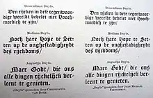 Van Dijck apparently had a strong reputation in his lifetime and beyond, aided by the connection between Protestant Britain and the Dutch Republic. Marshall considered him a "famous artist".[57] Moxon, who spent time in the Netherlands as a child and later met van Dijck on returning as an adult, wrote soon after his death that "Holland letters in general are in most esteem, and particularly those that have been cut by the hand of that curious artist Christofel van Dijck, and some very few others...when the Stadthouse at Amsterdam was finishing, such was the curiosity of the Lords that were the Overseers of the building, that they offered C. van Dijck aforesaid 80 Pounds Sterling (as himself told me) only for drawing in paper the names of the several offices that were to be painted over the doors, for the painter to paint by"[58] and also praised them extensively in his Mechanick Exercises of 1683.[59] Many, although not all, of his types are also identified in the Enschedé type foundry specimen dated 1768,[lower-alpha 5] specifically his smaller types and blackletters from the middle of the book.