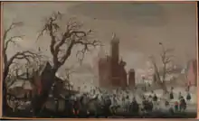 A 'Winter landscape' held by the Metropolitan Museum of Art was formerly attributed to Hendrick Avercamp, the pioneer of winter scenes in the Dutch Republic. It resembles another 'Winter landscape' held at the Mauritshuis in The Hague of the same period. The winter landscapes are more reminiscent of similar works painted by Adriaen van de Venne who was Van den Berghe's contemporary in Middelburg. Landscape paintings in Middelburg followed Flemish conventions which explains the earlier attribution of the Mauritshuis painting to Flemish landscape artists David Vinckboons and later to Paul Bril. Van den Berghe painted the figures in his landscapes himself which helps to distinguish him from other artists who would often use specialists for this task.[2]