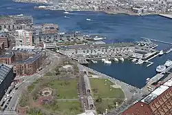According to a self-published work by the Massachusetts State Council of the Knights of Columbus, in 1967, their organization voted to establish a non-profit corporation to construct affordable housing.[1] The Boston Redevelopment Authority selected them to develop a parcel, but the Supreme Council of the Order did not like the idea.[1] The Massachusetts State Council constructed the Christopher Columbus Waterfront Park instead in honor of their patron, Christopher Columbus.[1]