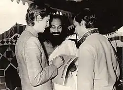 The conference generated some controversy[80] when Indian politics intersected with religion,[81] particularly the concept of Christ Yoga, a book Hills had written linking Christ's teachings to those of Buddha and the Vedas. But the conclave nevertheless emerged as a milestone in the soon-to-be-booming migration of Indian yogis to the West. John Hills,[82] helped by his father's prior relationship with Nehru, worked with India's Prime Minister Indira Gandhi and the Nehrus' yoga master Dhirendra Brahmachari to steer a fractious committee of MPs, ministers and often competitive spiritual leaders from disparate religions and castes into creating a uniquely diverse and widely hailed program of events.[83] Presenters from the West included transpersonal psychology pioneer Stanislav Grof and Sidney Jourard who compared their research in lively sessions with Indian scholars, scientists, philosophers and yogis such as B.K.S. Iyengar, Shri K. Pattabhi Jois, Jiddu Krishnamurti, Swami Satchidananda, Padma Bhushan Murugappa Channaveerappa Modi,[84] R.R. Diwaker, Swami Rama, Acharya Dharma Deva Vidya Martand, Kaivalyadhama Health and Yoga Research Center and yoga hospital founder G. S. Melkote,[85]
