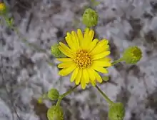 This is a short-lived perennial herb or subshrub growing 30 to 70 centimeters tall from a fibrous or rhizomatous root system. The erect, woolly-haired stem has densely hairy, glandular leaves, the lowest ones measuring up to about 10 centimeters in length. The top of the plant is occupied by a branching inflorescence of variable size, bearing 1 to 25 or more flower heads. The head has many yellow ray florets each measuring less than one centimeter long. Blooming occurs in November and December.[4] The fruit is an achene two millimeters long tipped with a tiny pappus of bristles.[7] These fruits are dispersed on the wind.[4]