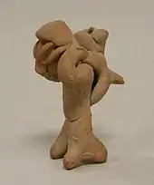 The clay figurines were crafted using ancient techniques, such as applique, incising, and punctation. Elaborate applique was used to create the figurines' distinct features, including their large noses, eyes made with small strips or punctations, and small slit mouths. The figurines were often depicted with minimal clothing, most showing genitals, with female features often being exaggerated. The most variable features of the figurines were their jewelry and headdress arrangements. They were painted with red and white pigments, applied by brushing or sprinkling the pigment onto the figurine's cracks and grooves. These figurines were possibly created to serve as companions to the deceased or effigies of their family members.[10]