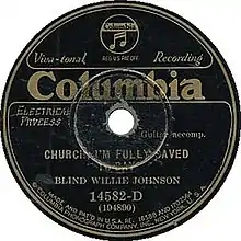 "Church, I'm Fully Saved To-Day" is a gospel blues song recorded by Blind Willie Johnson in 1930, with backing vocals by Willie B. Harris, sometimes identified as his first wife. It was released on Columbia 14582-D, as B-side to "The Soul of a Man".[1] The song is derived from the hymn "Fully Saved Today" by William J. Henry (words) and Clarence E. Hunter (music), published in 1911, and follows a call-and-response format.