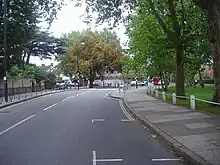 Church Road, Barnes is a street in Barnes in the London Borough of Richmond upon Thames.[1] It runs from the junction between Rocks Lane (heading south towards Barnes Common and Barnes Station) and Castlenau (running northwards to Hammersmith Bridge) by the Red Lion pub, westwards to the end of Barnes High Street. It takes its name from the St Mary's Church, a Church of England building dating back to the twelfth century. Also located on the street are the Sun Inn and the early eighteenth century The Homestead, both Grade II listed.[2][3] Barnes Green runs on the south side of the street. The Olympic Studios were located in the street, notable for the records that Jimi Hendrix made there.[4]