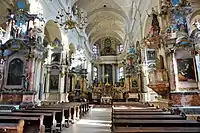 The bell tower is high and massive with elaborate decorations. After a fire in the 18th century, it was restored and finished with a rococo-style dome roof. Marcin Knackfus prepared project for the church's altar. Above the high altar rises another altar reminiscent of a royal throne with a canopy. A belfry was erected and the sculptures in the interior were created in the 18th century. In 1859 the polychrome interior décor was enriched. East of the church lies a square, in which the Convent of the Barefoot Carmelites once stood alongside a Baroque Church of St. Joseph the Betrothed established in 1638 by the Vice-Chancellor of the Grand Duchy of Lithuania Stephen Pac. Its exterior was reminiscent of the Church of St. Theresa, Vilnius.[1] In 1877 the Church of St. Joseph the Betrothed was demolished by the tsar's order, to be replaced by a market (presently it is a square).