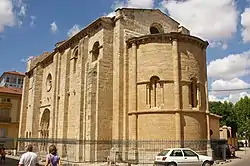 Built in the 12th century, La Magdalena is a small Romanesque church of the Knights Templar. At their suppression, it was given to the Order of Malta. The exterior features a deeply recessed south entrance, with circular arches and shafts, as well as ornate Romanesque work. The rose window, formed with small columns, is similar to the Temple Church in London. The interior includes canopied tombs dating to the 13th century, supported by spiral and fluted shafts. Against the north wall, there is a tomb under a canopy supported by three shafts. The sepulchre itself is plain, carved with a cross; the effigy of its occupant is carved, as if lying on a bed, out of a bold block of stone, and inserted in the wall; above this is the soul (in the shape of a head with wings) supported by angels.[1]