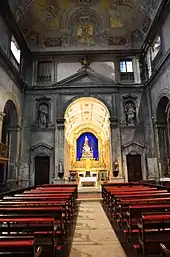 The presbytery has rhythmic marble walls with pilasters, surmounted by a vaulted-ceiling, with painted panels, guarding a gilded retable and altar with the image of Our Lady of the Conception.[1]