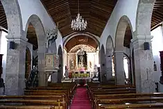 The interior of the church contains many valuable religious art, of which its gilded retables are its most prized. In addition, it is also decorated by several paint panels, that include the Resurrection, the Last Supper, the Ascension of Christ, and Four Evangelists, among others. Further, three silver-plate lamps and pulpit, mark the influence of the Baroque period on the temple.