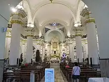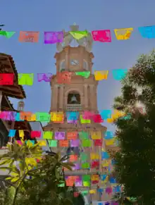 The Church of Our Lady of Guadalupe, known locally as the Iglesia de Nuestra Señora de Guadalupe, is a Catholic place of worship in Puerto Vallarta on the Pacific Coast of Mexico. It is open daily, with services in English available on Saturdays and mass in both Spanish and English on Sundays.[1] The Church, built between 1930 and 1940, was constructed on the original foundations of a chapel initially dedicated to Lady Guadalupe in 1901. The Church is dedicated to Our Lady of Guadalupe, also known as the Virgin Mary. She is the patron saint of Mexico and is considered a religious symbol of Catholic faith and female empowerment.[2] Her feast day on 12 December is also the date of her first apparition. To celebrate this festival (fiesta), many individuals in the Mexican community display altars in their homes consisting of a painting of Our Lady of Guadalupe surrounded by flowers, candles, and other individual touches.[3] During this time, members of many churches, including the church in Puerto Vallarta, light fireworks after the evening rosary leading up to 12 December, the day in 1531 that La Virgen de Guadalupe had her first interaction with a Mexican man named Juan Diego, which essentially established Catholicism in Mexico.[4] She is depicted as a dark-skinned woman whose dialect is Nahuatl, which is Juan Diego's native language.[2] Originally classified as a symbol of religion and faith, her significance in current times surpasses her role in Catholicism. Today, some see her as a figure of Mexican patriotism and liberation.[5]