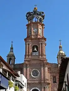 The Church of Our Lady of Guadalupe (Puerto Vallarta) is in the centre of the town square. It was built between 1930 and 1940. The church is not based on a sophisticated design but is an encapsulation of the parish priest's ideas and the rustic townscape of the past. The church has a neoclassical structure, and the crown seated above the main building is indicative of baroque style European temples.[9] The original church crown eroded because of weather and was restored in 1981, however, in 1995 it was damaged by a strong earthquake and replaced with a temporary fibre glass structure.[9] In 2009, Carlos Terres, a Jaliscan artist, sculptured and rebuilt a replacement for the crown. The church's towers reflect the renaissance age.[21] In parish documents, Father Luis Ramirez refers to the Church as, "an expression of village art, which symbolises the authentic urban look of Puerto Vallarta".[9]