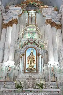 The church has two bell towers with bulbous domes. The domes are covered with shards of tiles, a feature found in other churches of the region. The church has a monumental pediment with volutes, a stylized oculus at center, and a niche above. The church has three bronze bells, the largest dating to 1872.[3][1]