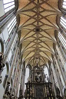 Also the vault in the main chancel is not original. The original Gothic vault, which was even higher than the current one, was already completely destroyed by the end of the 16th century. In the 17th century was the church vaulted by the Franciscans. Along with the building of the new Renaissance vault, the vaultings of the windows were lowered, which can be still seen from the outside.