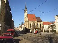 The Gothic Church of Our Lady on the Lawn (Na Slupi) (Czech: Kostel Zvěstování Panny Marie Na trávníčku) is located in the valley of the Prague Botič Stream below Vyšehrad in the New Town. It is quite a small Gothic building which was built beside the monastery of Servites. The church is dedicated to the Annunciation of the Virgin Mary. The church and the monastery have been listed as historical monuments since 1958. The church was founded 24 March 1360 by Charles IV. and was built between 1360 and 1375. Its current look is mostly in pseudo-Gothic.