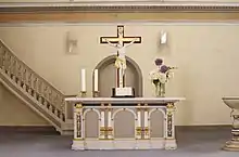 The interior was completely remodelled in two phases in the 19th century. After the choir gallery was separated off in 1852 and the baroque organ was installed in the north gallery, a new central window was placed on the site of the organ in the choir, with a figure of Christ making a blessing in the Nazarene style, probably from the workshop of Heinrich Beiler the Elder, the leading Heidelberg historicist glass painter.[4] In a second phase of renovation between 1878 and 1885, the architect and church building inspector Hermann Behaghel remodelled the space in the neo-renaissance style in which it remains to this day. Behaghel had the old galleries removed and erected single-story galleries on three sides in symmetry with the axis of the church. The choir with its altar and pulpit was set off by steps and a balustrade. The stucco ceiling was also an addition by Behaghel. The two side-windows of the choir depict Grand Duke Charles Frederick (left) and Elector Otto Henry (right). They were donated in 1886 by the University of Heidelberg on their five-hundredth anniversary.[5]