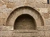 At the front left of the chapel is the baptismal font, made of granite in a simple circular form.[1] This baptistery is demarcated by an iron gate crowned in stylized fleur-de-lis. Alongside is a stone with inscription stating that the baptistery was used to baptize Afonso Henriques in 1106. Lateral porticos are carved into simple arches.[1] A full triumphal arch is decorated with frieze with interlocking ribbon motifs, while a cornice runs across the perimeter of the temple.[1]