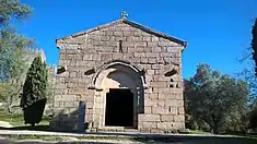 The longitudinal church existing of a single rectangular nave and chancel, is built on staggered horizontal spaces covered in a tiled-roof.[2] The walls are constructed in granite blocks topped by gables, while the lateral walls support double eaves.[1] The main facade with portico with interrupted lintel includes a double arch with simple tympanum. The archway is flanked by beams supporting the main body, while a slit window surmounts the entrance and a cross fleury at the apex of its frontispiece.[1] The lateral southern and northern walls are accessible by doors with lintels, and surmounted by demarcated arch with complementary beams and slit windows (as in the facade, but less grande).[1]