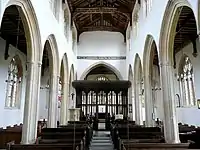 Choir stalls are of the 15th century, as are many of the pew bench ends. The pulpit and lectern are also of the 19th century. There is a canopied stoup, and a 12th-century lead-lined tulip bowl font[1] on a stem with rope moulding.[6] The church has five bells cast in ca.1500, 1641, 1763, 1795, and 1877.[7] A brass engraving in the chancel floor is dedicated to the rector John Dyer (died 1499) who paid for the rebuilding of the chancel.[8]